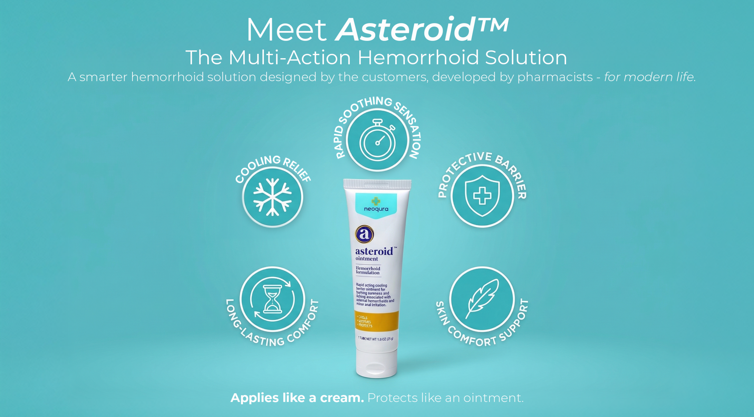 Introducing Asteroid™ Ointment, brought to you by Neoqura. Asteroid™ Ointment is a new rapid-acting cooling barrier ointment designed to bring relief to the itching, burning, and soreness caused by minor anal irritation and external hemorrhoids.